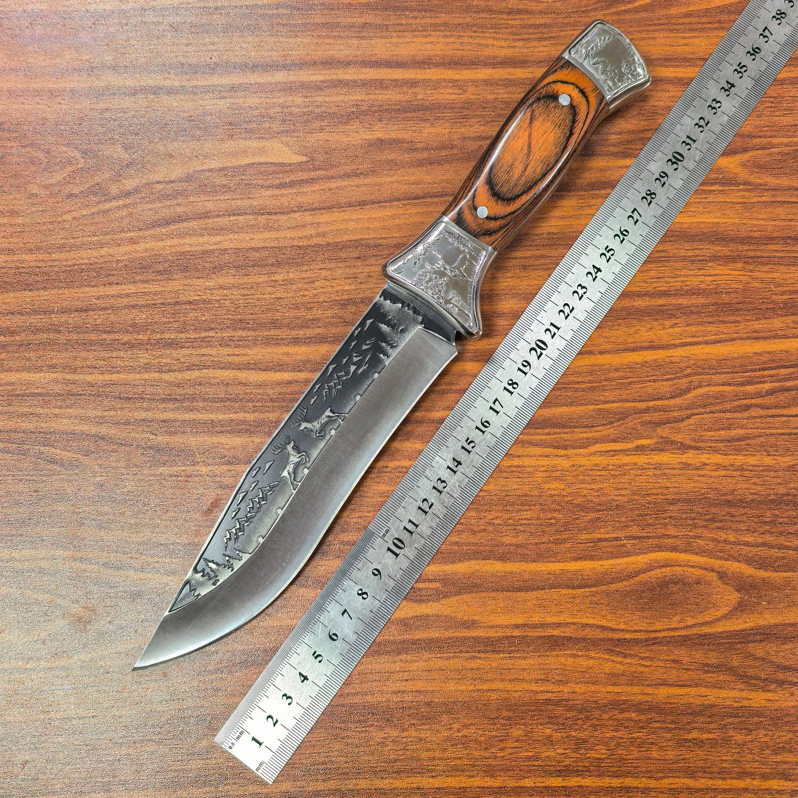 A survival knife with a black nylon sheath and a wooden handle, a fixed knife, a powerful hunting knife, a gift for men