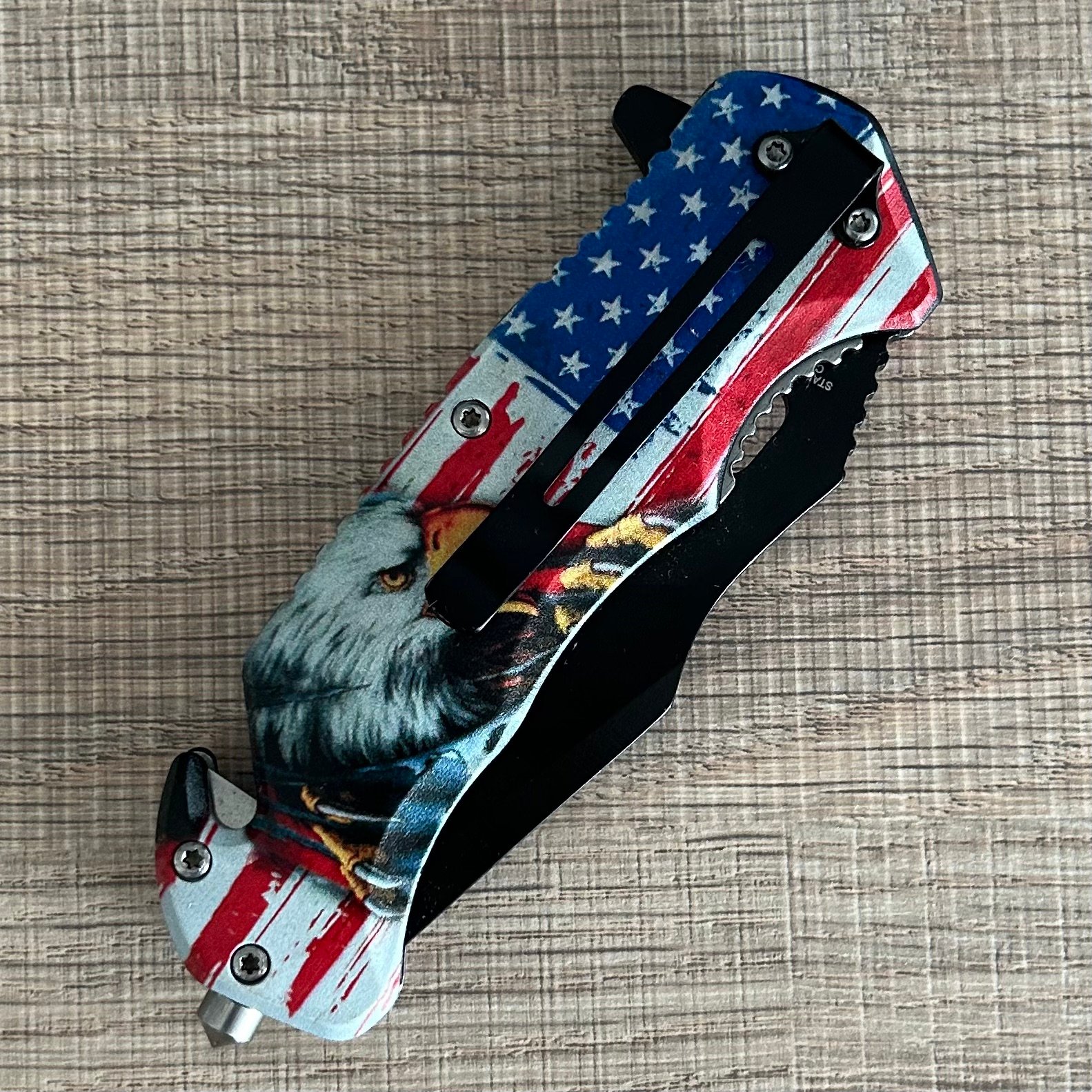 wholesale 4.75″ USA Eagle Folding Pocket Knife – Patriotic EDC Folding Knife with 3.5″Black Blade, American Flag ABS Handle, Belt Clip, Glass Breaker & Seat Belt Cutter for Outdoor Use